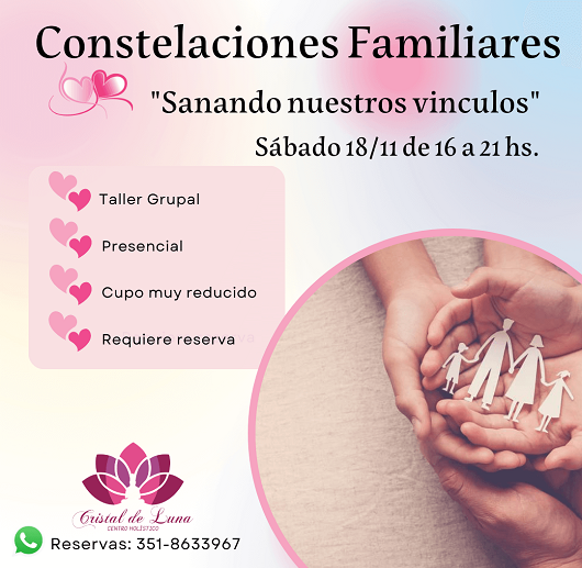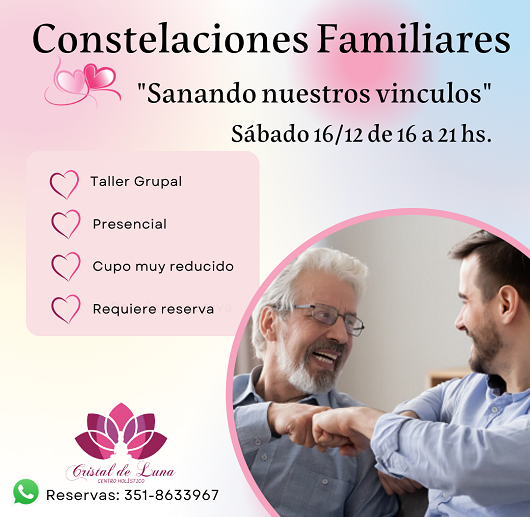 TALLER DE CONSTELACIONES FAMILIARES GRUPALES MES DE DICIEMBRE ¿QUE SON LAS CONSTELACIONES FAMILIARES?Las constelaciones Familiares son un método terapéutico basada en la mirada sistémica de Bert Hellinger, donde las heridas originales, las dinámicas disfuncionales e implicancias que generan malestar dentro de un sistema familiar salen a la luz. Las constelaciones …
